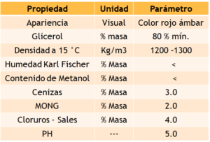 Subproducto del proceso de producción de biodiesel, se obtiene de un proceso de refinación intermedio, donde se han removido los ácidos grasos, el material orgánico no glicerinoso y el agua hasta obtener una glicerina con menos de 18% de humedad.